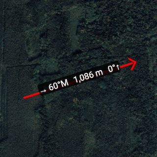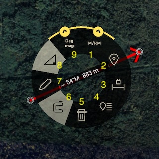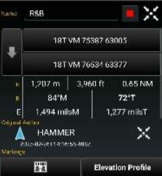 Закрепленная линия R&B покажет азимут, расстояние и угол снижения или подъема между двумя точками. Чтобы переставить точку привязки, выполните длительное нажатие на любом конце линии R&B, затем коснитесь другого местоположения. Линия будет перемещена в новое местоположение с скорректированным расстоянием и азимутом.