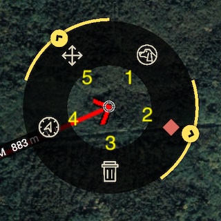 Выберите любой конец линии R&B, чтобы отобразить круговое меню конечной точки линии R&B. Чтобы внести точные корректировки любого конца линии, коснитесь иконки Точная настройка позиции (5) в круговом меню. Появится перекрестия, и увеличенная область карты вокруг него.