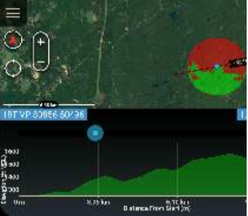 Опция Профиль высоты (Elevation Profile) в нижней части карточки Детали отображает профиль высоты для выбранной линии R&B в нижней части карты при выборе. Профиль высоты предоставляет информацию о Максимальной высоте, Минимальной высоте, Наборе и Потере высоты. Установив флажок Показать зону видимости, будет показана зона видимости вдоль линии. Перемещайте синюю точку влево или вправо, чтобы продвигать зону видимости вдоль линии. Линию R&B можно отправить или транслировать другим пользователям из подменю Показать детали или из карточки Детали.