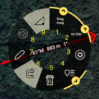 См. раздел Ищейка (Bloodhound) для получения более подробной информации об опции кругового меню Ищейка (Bloodhound) (8). Выберите круговое меню Поменять единицы измерения угла (1), чтобы отобразить дополнительные опции единиц измерения угла, включая Градусы сетки (измеренные относительно фиксированных линий сетки проекции карты), Тысячные сетки, Градусы магнитные, Тысячные магнитные, Градусы истинные или Тысячные истинные. Выберите круговое меню Поменять единицы измерения расстояния (2), чтобы отобразить дополнительные опции единиц расстояния, включая Морские мили, Метры/Километры или Футы/Мили. Если длина линии R&B больше примерно 30 км, линия будет следовать контуру земли, а не будет прямой линией от одной конечной точки до другой. Чтобы внести изменения в параметры линии, выберите иконку Показать детали (4) в круговом меню.